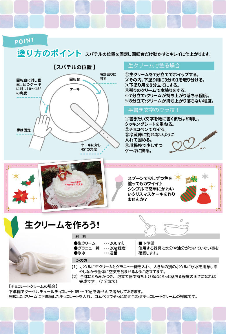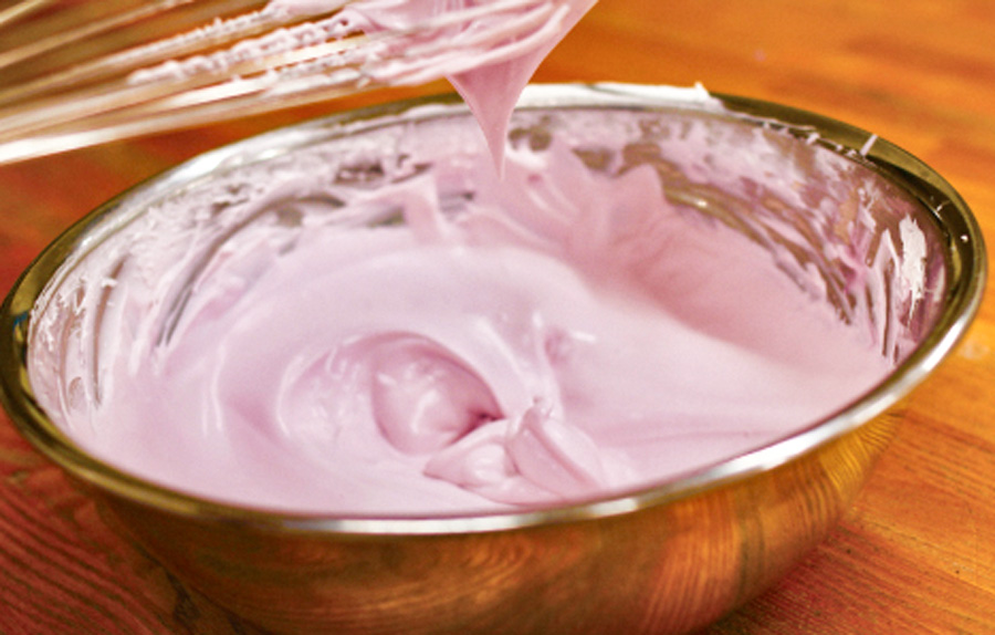 【本塗り1】余ったクリームに牛乳を加え、7分立てになるように混ぜます。クリームの色を変えたい場合は、ここで色素を加えます。★7分立て:クリームが持ち上がって落ちる程度。