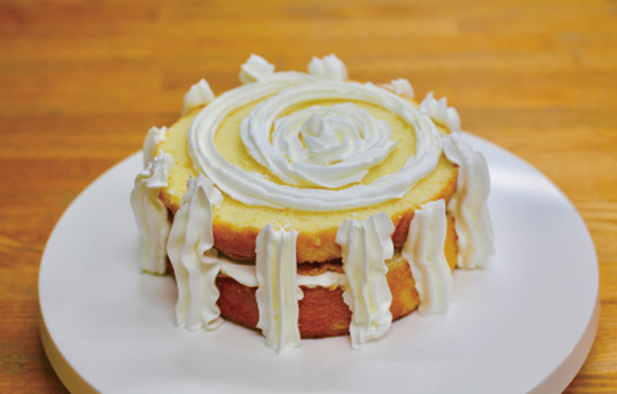 【下塗り1】スポンジに、約1cm間隔でクリームを絞ります。