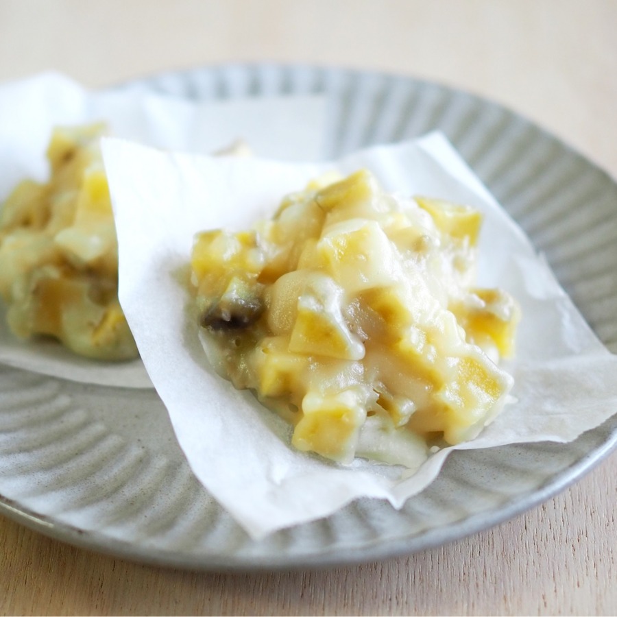 - ボウルに角切りにしたさつまいも、砂糖、塩を入れ混ぜ、15分ほどおいて味をなじませます。