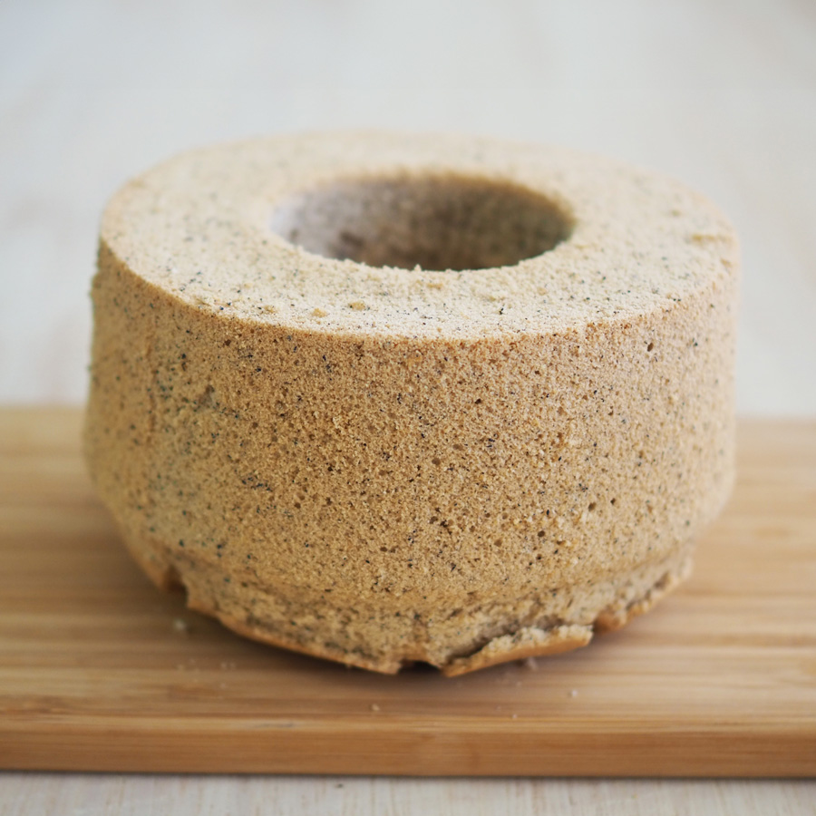 焼き上がったら、型を逆さにして完全に冷まし、シフォンケーキナイフで型から外します。