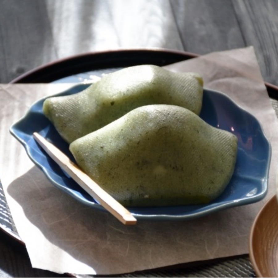 下準備したよもぎ粉をほぐして2~3回に分けて加え、ムラがなくなるまでよく混ぜます。