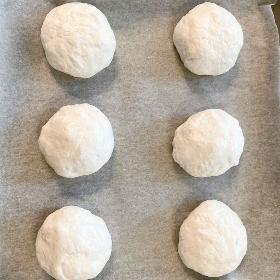 最初に丸めた生地から丸め直し、表面がツルツルになるまでコロコロ転がしたら、クッキングシートを敷いた天板に並べます。