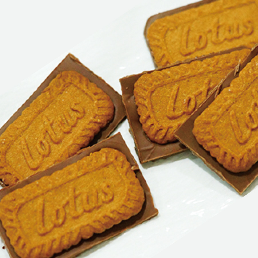 バターが溶けたら湯せんから外し、オーブンシートを敷いた型に流し込み、表面を平らにして、ロータスビスケットをのせて冷蔵庫で30分程度冷やし固めます。