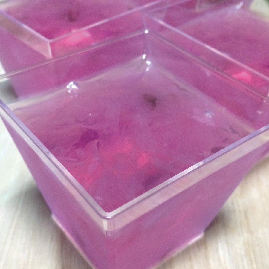 - 桜花蜜漬の桜花を入れておいた容器に手早く流し込みます。 ゼリー液を充填してから桜花蜜漬を浮かべても良いです。