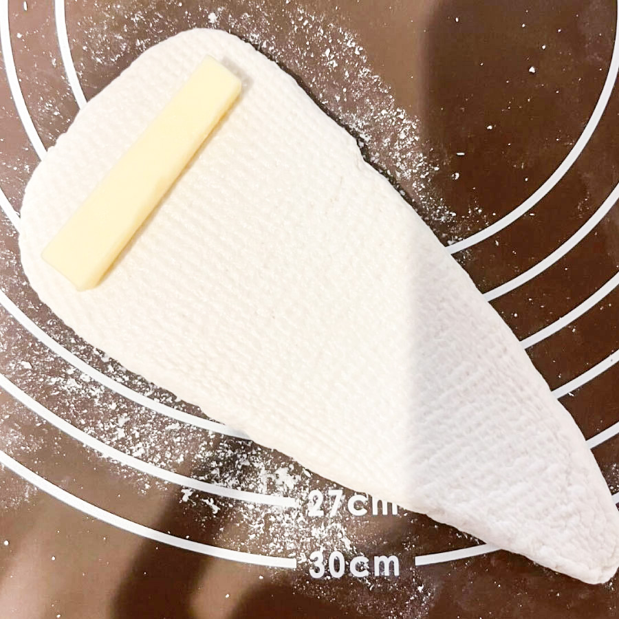 めん棒で三角形になるように伸ばし、バターをのせて巻きます。