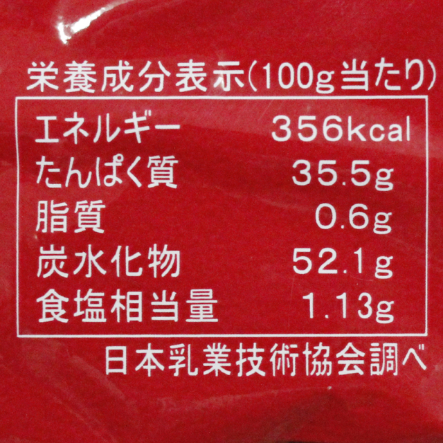 栄養成分表示(100g当たり) エネルギー 356kcal たんぱく質 35.5g 脂質 0.6g 炭水化物 52.1g 食塩相当量 1.13g