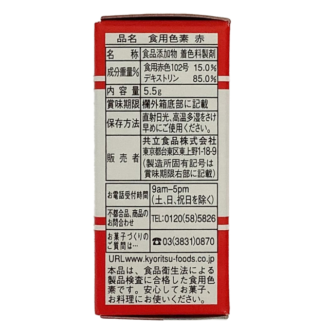 | 成分重量% | 食用赤色102号 15%、デキストリン85% |