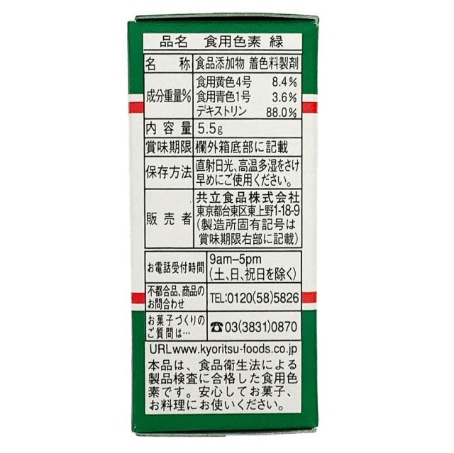 | 成分重量% | 食用黄色4号 8.4%、食用青色1号 3.6%、デキストリン88.0% |